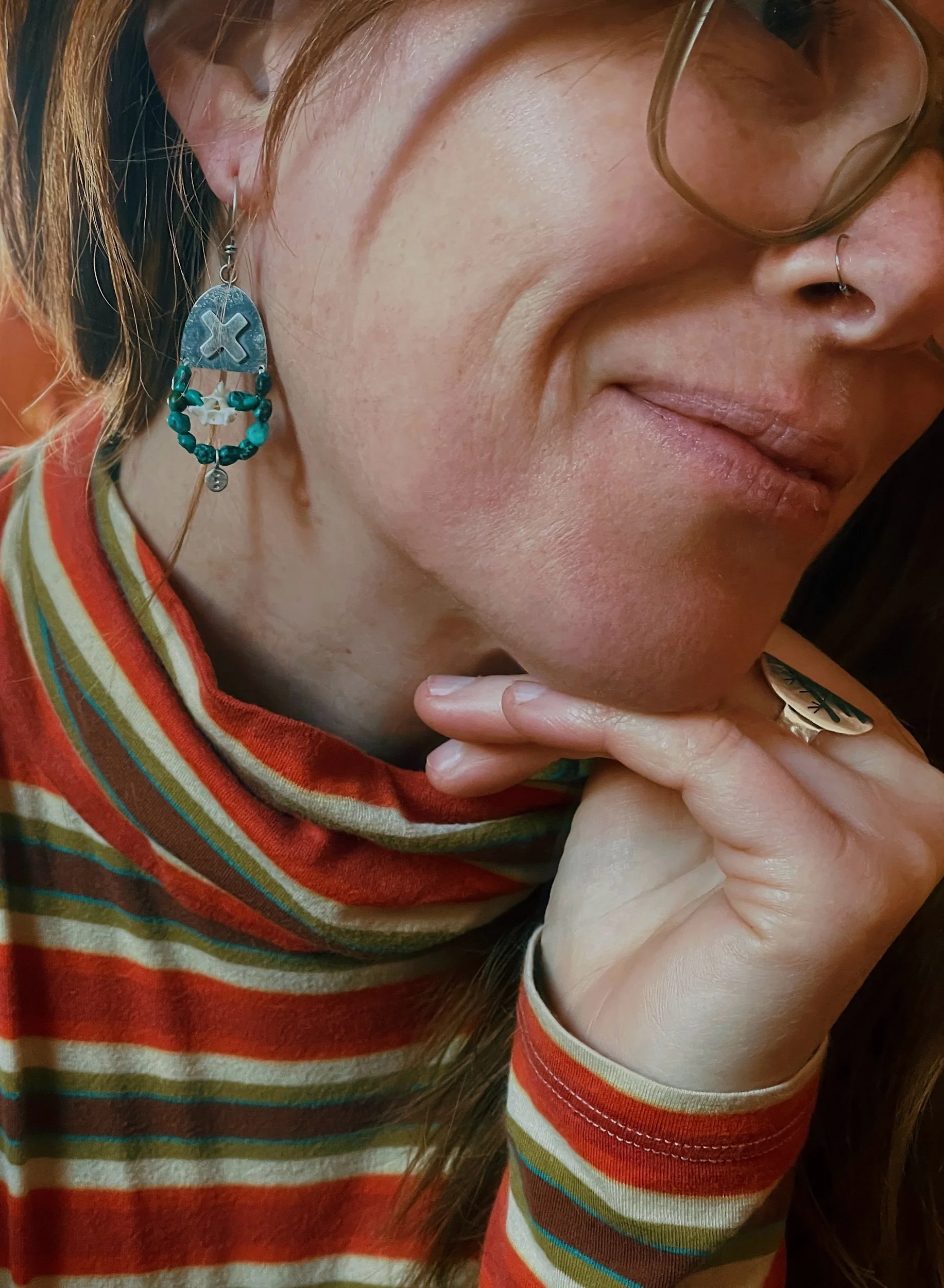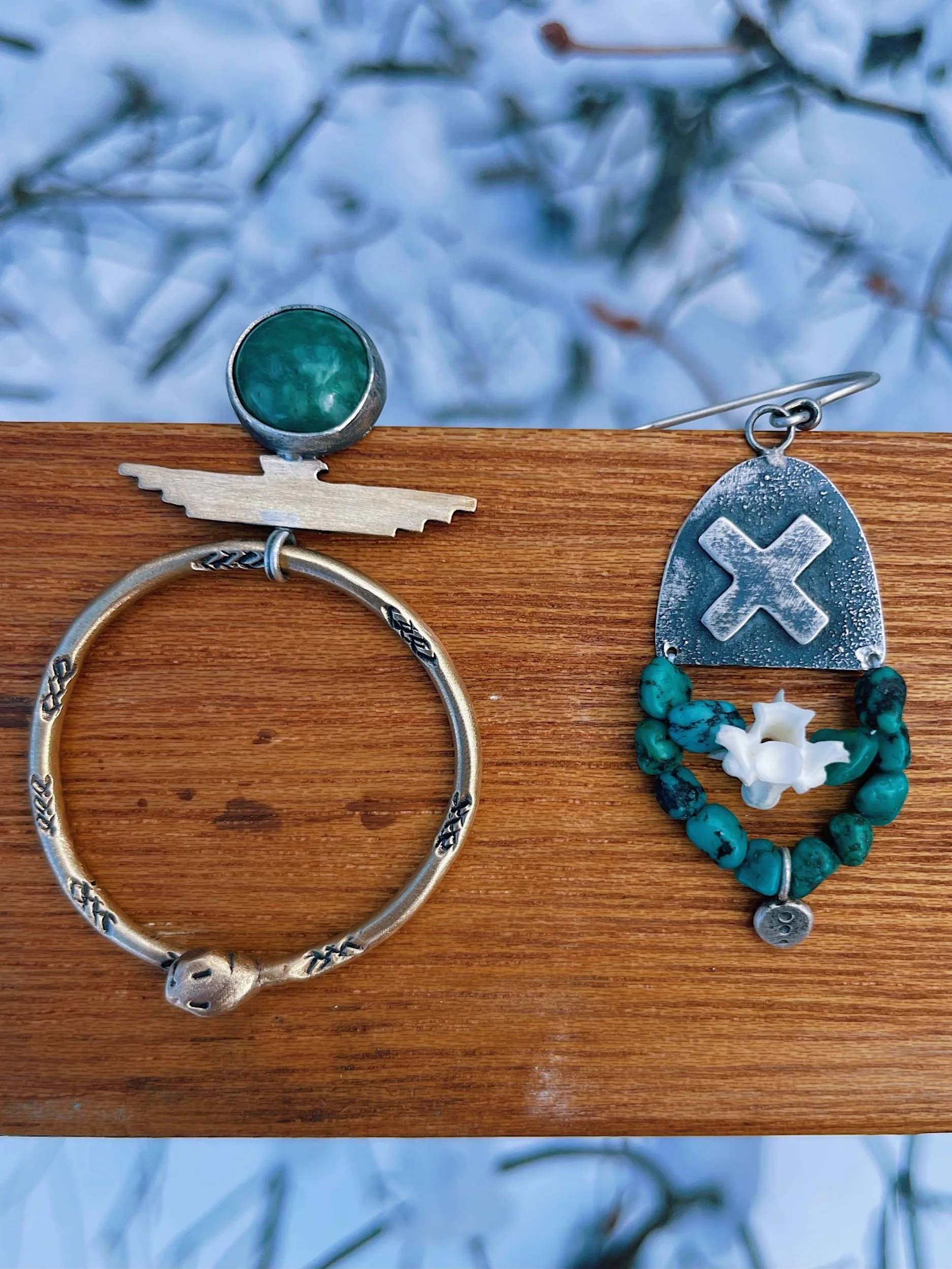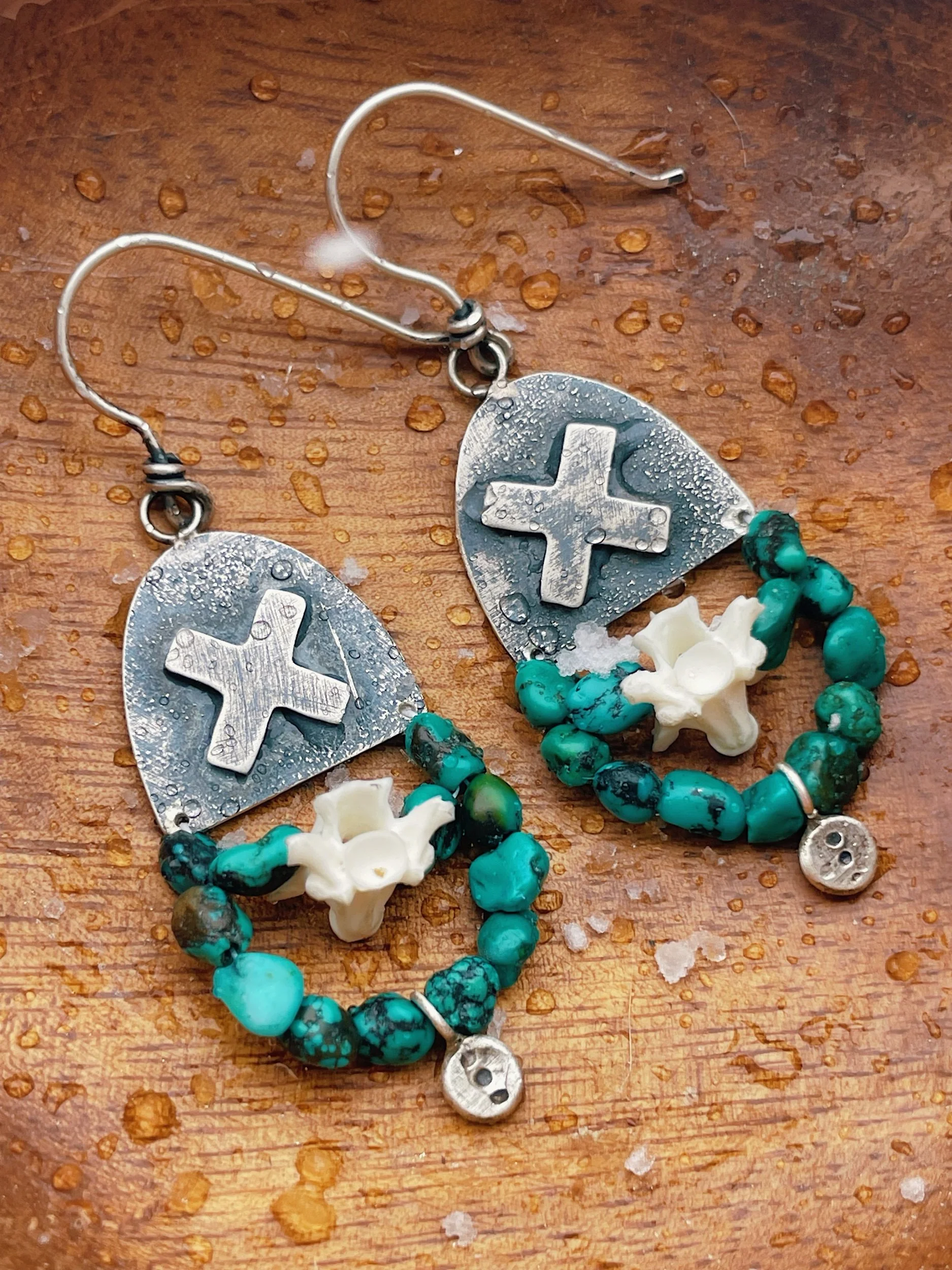 turquoise and snake vertebrae beaded onto sterling silver distressed earrings. Giving a raw and untamed feel ready for any adventure.